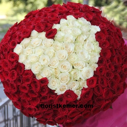 kirmizi beyaz guller kalp seklinde vazo