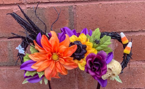 halloween inspired floral black vine mouse ears with candy corns orange wild daisy purple apple blossom yellow sunflower black rose purple filler